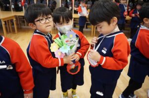 かっこいい体操を見た後は「ありがとう」「がんばってね」と気持ちを込めたプレゼント交換をしました🎁✨