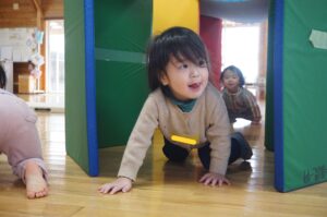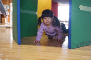 マットを立てて作ったトンネル!!せまーいトンネルをと王のがとっても楽しかった様子😊