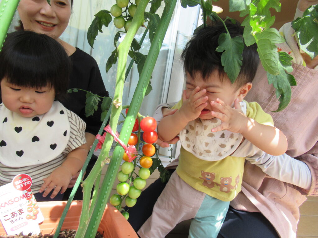 初めてトマトを触るおともだち。何かなぁ⁈😊🍅
