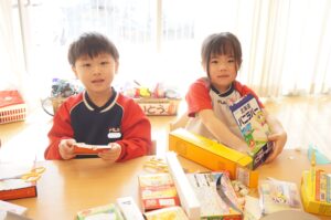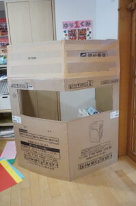 箱を切ったりくっつけたり、紙皿の上にいろいろな素材のものを乗せてご飯を作ったり・・・