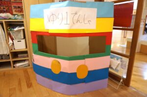 画用紙を貼って色鮮やかな電車になりましたが子どもたちにとってはまだまだ寂しく感じるようで・・・