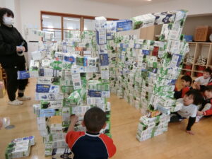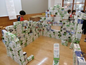 牛乳パックを材料にどんどん積み上げていきます!!