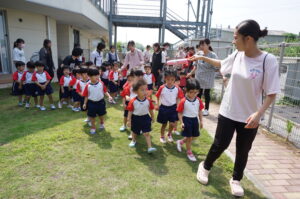 今回はいつもとは違い、ホール前の園庭に避難しました!