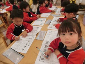 椅子に座って集中できる時間も長くなり、お勉強では取り組む時の姿勢や鉛筆の持ち方、書き順に気を付けながらノートを進めています!