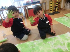 今年度最後の壁面づくりでは手型をぺたぺた押したりテープを貼ったりしながら完成させました✨