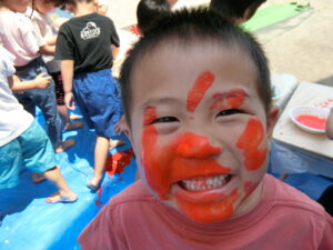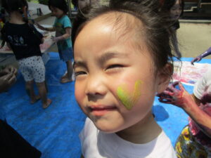 そんな中、「みてみて~!!」と呼ばれて見てみると顔にペタッと絵の具を付けて遊んでいる子が😆!!
