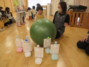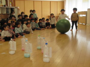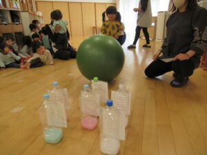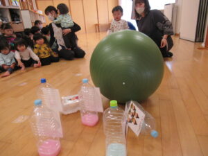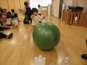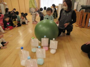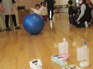 おおきなボールを一生懸命転がし、ピンが倒れると