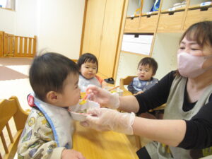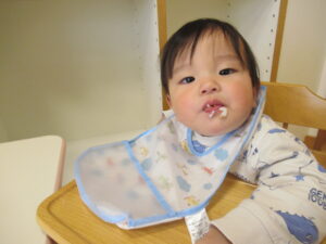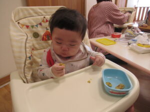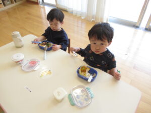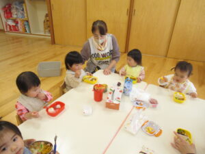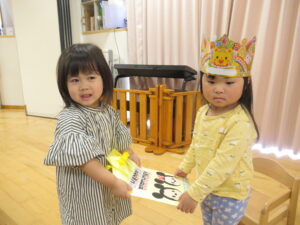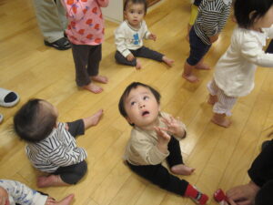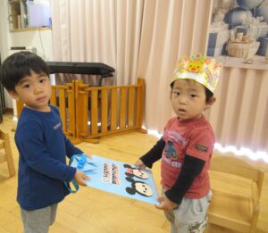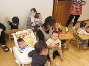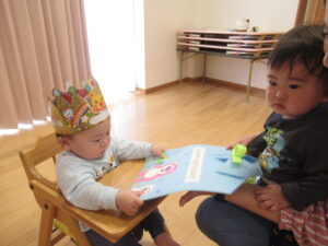 0歳児(つくし組)の2人もご機嫌で誕生日会に