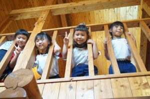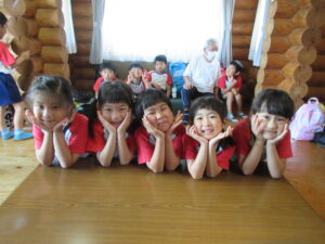 「わぁ!!」と大きいログハウスにテンションが上がったさくら組さん