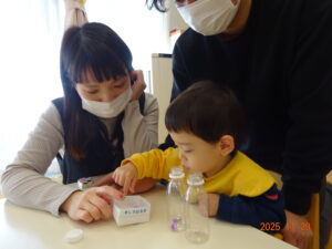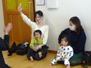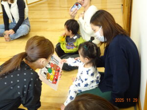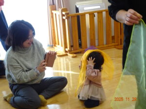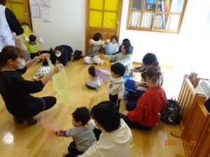 親子でカラフル布を使ってのあそびは、楽しい時間だったようです。